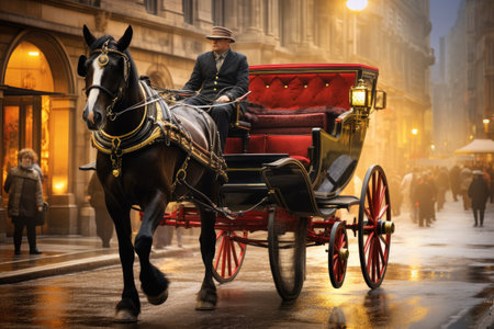 A horse-drawn carriage travels along a bustling city street, showcasing a nostalgic mode of transportation, Antique horse-drawn carriage riding through a city street, AI Generated