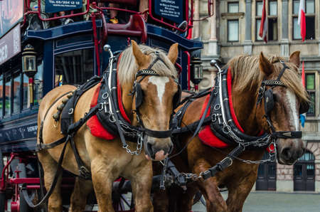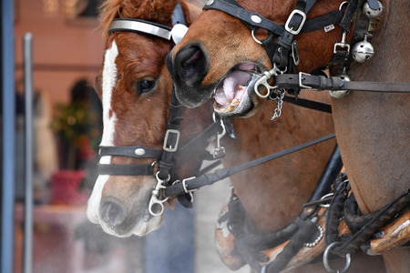 Two brown harnessed horses in Vienna, close-up photo of city horses in Austria