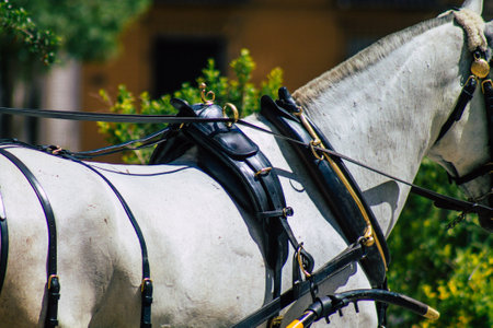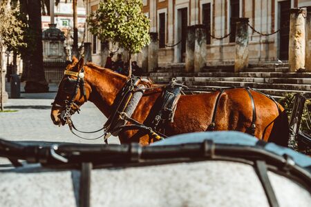 Seville Spain July 03, 2021 Horse drawn carriage ride through Seville. Travel through the historic center of Seville and during the carriage ride people will be able to contemplate the main monuments