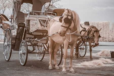 Infrared photography, two horses waiting with carriage behind them
