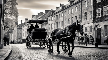 Early 19th Century Carriage Ride in Black and White horse-drawn carriage travels along cobblestone street