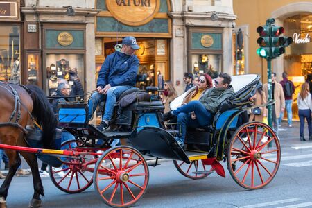 Rome, Italy - February 15, 2020: Couple of tourists visit the city center traveling on a carriage with horses. The driver illustrates the beauties of the capital to his customers sitting in the carriage.
