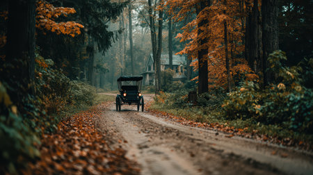 A charming vintage car travels down a quiet autumn road, surrounded by colorful foliage and serene trees. This scene captures the essence of peaceful exploration and nostalgia.