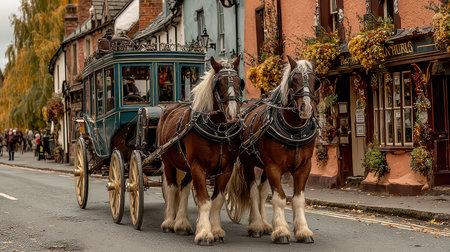 A captivating view of a horse-drawn carriage gliding through a quaint village on an autumn day, showcasing traditional transport amidst colorful foliage.