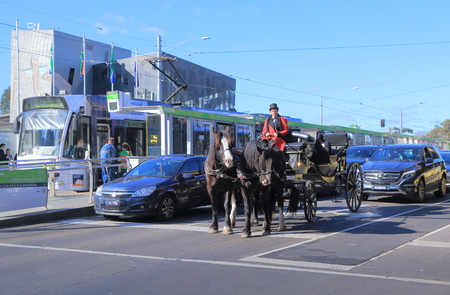 Melbourne Australia - July 16, 2016 Horse carriage, cars and tram wait for traffic light on Swanston Street in Melbourne Australia.