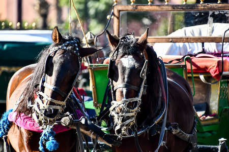 Horses with wagons in winter on the main square of Salzburg in Austria. Entertainment of tourists, riding. Attractions.
