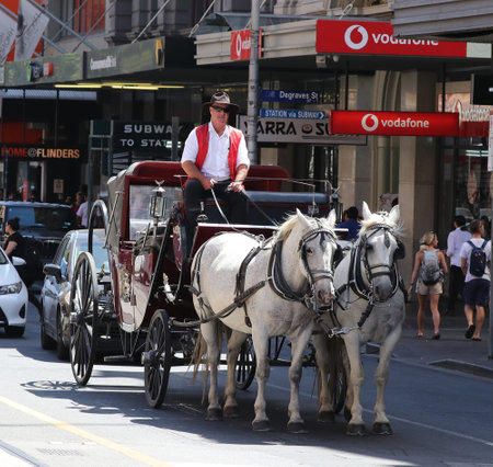 MELBOURNE, AUSTRALIA - JANUARY 25, 2019: A horse-drawn carriage on the street in Melbourne. Carriage ride is popular among tourists in Melbourne