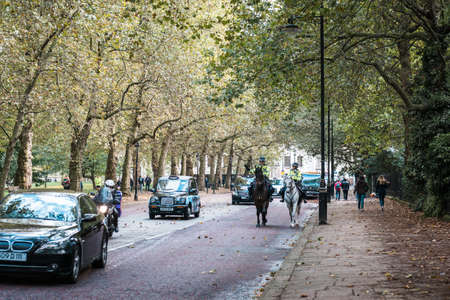 London, United Kingdom - October 18, 2016: Mounted police officers riding horses in streets of London, UK