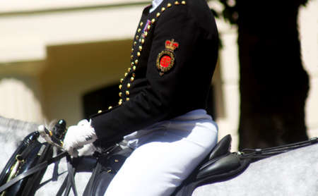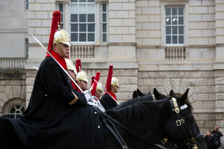 London, United Kingdom - January 18 2018: Members of the Queen's Royal Horse Guards on horses, riding to the changing of the guard ceremony in Horse Guards Parade, London United Kingdom