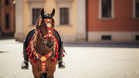 February 20, 2019. Denmark. Copenhagen. Training bypass Adaptation of a horse in the royal stable of the castle Christiansborg Slots. Man rider in uniform and helmet and racehorse outdoors.