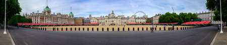 LONDON - May 18, 2022: Pano of Horse Guards Parade with seating for Platinum Jubilee Trooping of The Colour