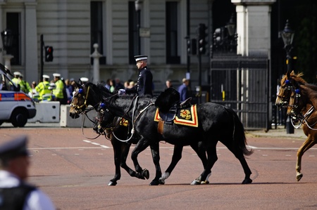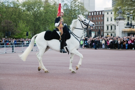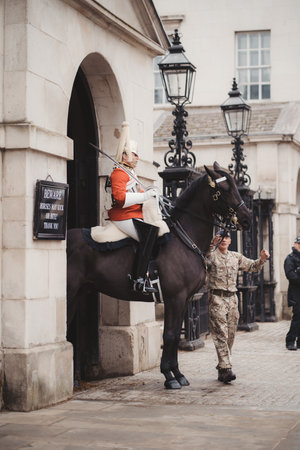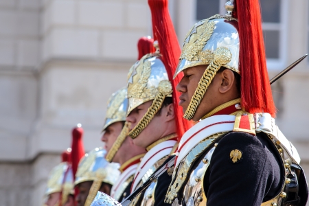 LONDON, UK - APRIL 20: Members of the Household Cavalry on duty at Horse Guards building during the ceremony of Changing of the Guard in London on April 20, 2012. The Cavalry are the lifeguards of Queen Elizabeth II of England