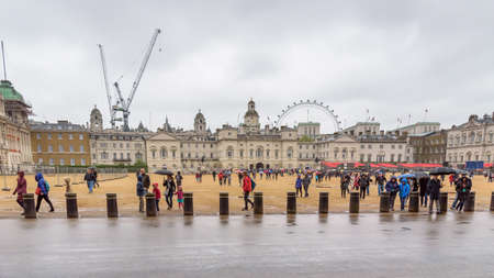 London, UK - April 28, 2018: Tourists with umbrellas visit Horse Guard Parade in central London at rainy day
