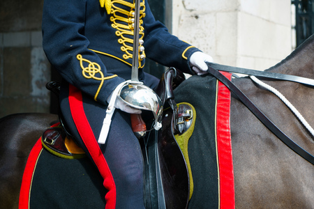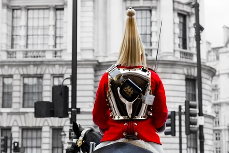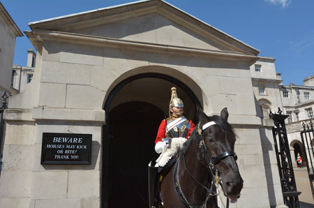 LONDON, UK - MAY 13 2015:A mounted trooper of the Household Cavalry on duty at Horse Guards.The soldiers charged with guarding the official royal residences in the United Kingdom.