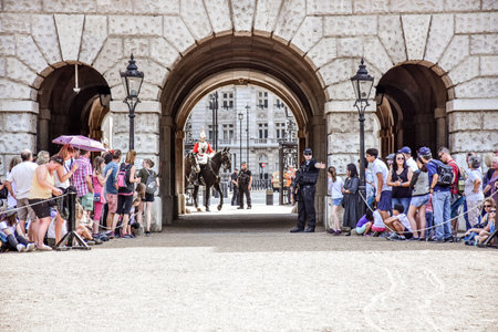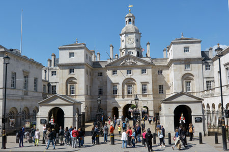LONDON - MAY 13 2015:Visitors at Horse Guards.The building famous for the sentries who guard the entrance to the Horse Guards Parade ground the place of the daily ceremonial changing guards.