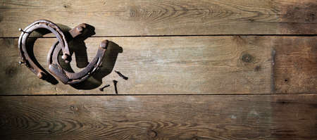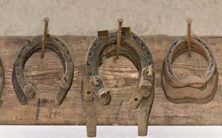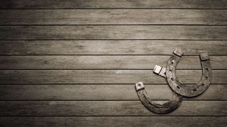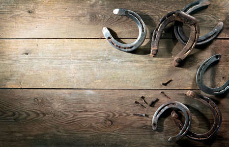 Equesrtian background. Lucky old horseshoes laying at wooden background.