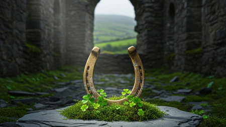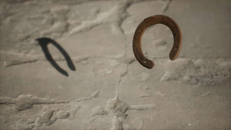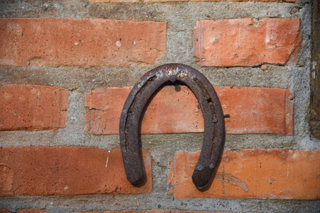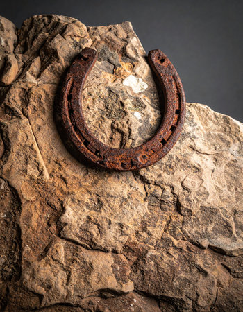 An old, rusty horseshoe rests on a weathered stone, a forgotten relic from a bygone era. Its corroded surface tells a story of time and tradition, representing a timeless symbol of luck, fortune, and enduring strength against the elements.