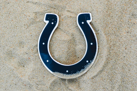 Horseshoe symbol of good luck lies on the stars of the American flag