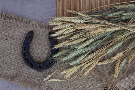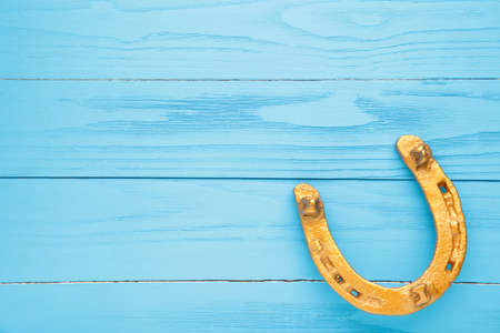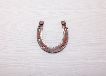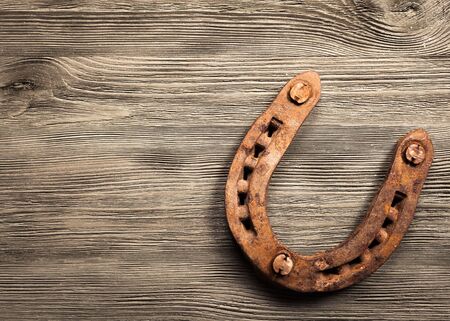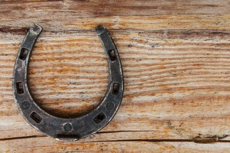 Cast iron metal horse horseshoe. Good luck symbol, St.Patrick's Day concept. Old wooden background, horse accessories, top view