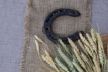 On a jute napkin lies an old horseshoe and ears of wheat.