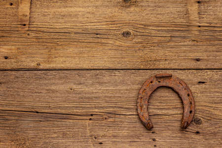 Old rusty horseshoe on a pine board. natural wood background. Place for text.
