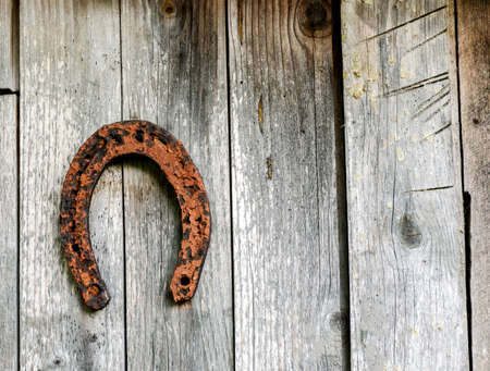 A closeup shot of an old rusty horseshoe hanging on a wooden door