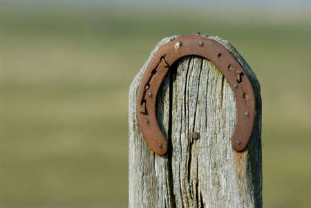 Rusty horseshoe standing vertically on weathered wood, representing luck and good fortune