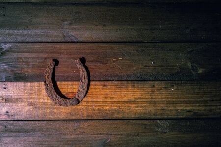 Old rusty horseshoe on vintage wooden board- rustic scene in a country style. Old iron Horseshoe - good luck symbol and mascot of well-being in a village house in Western culture.