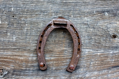 Rusty horseshoe sitting on weathered wood, representing good luck and vintage western style
