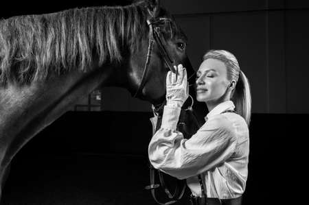 Portrait of a stylish woman hugging a thoroughbred horse. Love and care concept. Mixed media
