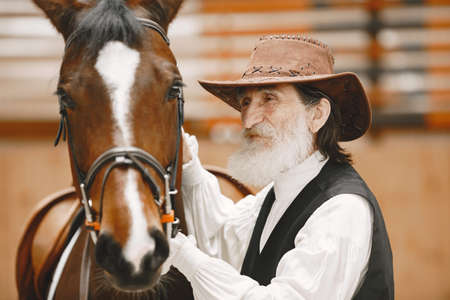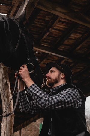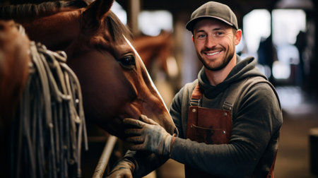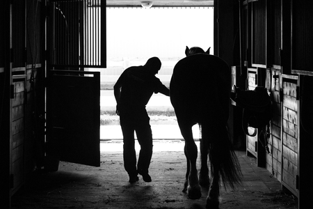 Horseman with a horse in the stable. Animal care.
