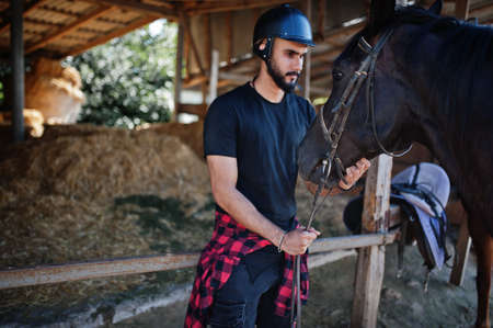 Arab tall beard man wear in black helmet with arabian horse.