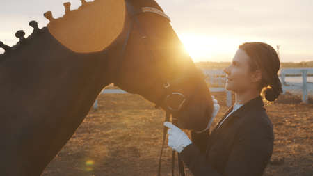 Horse owner looking at her dark bay horse with love. Smiling and expressing her love for the Stallion. Holding horse bridle. The footage is made during the Golden hour. Love for horses.