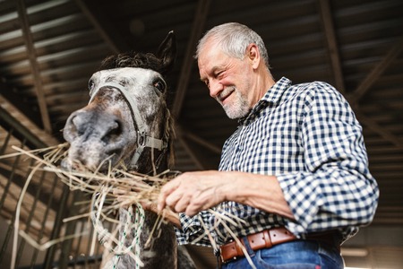 A close-up of a senior man feeding a horse hay in a stable.