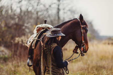 Young beautiful dreadded girl outdoors with her true horse.