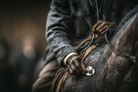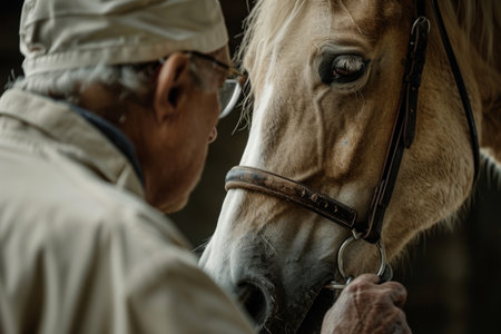 Calm moment as a vet gently examines a horse head outdoors, symbolizing trust, animal care, and professional equine health.