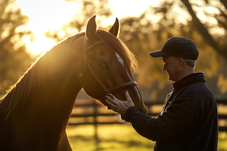 A man in a cap stands close to his horse, sharing a bond in the warm sunset light on a farm.