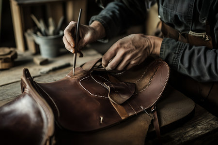 Skilled artisan diligently crafts a beautiful leather saddle using traditional techniques with care. Generative AI