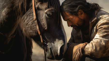 A man with long hair is petting a horse, AI