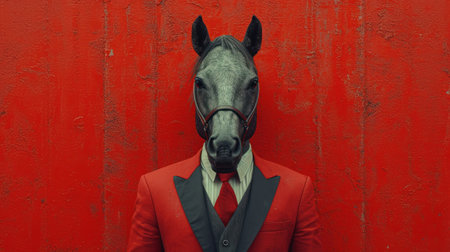 Horse mannequin in suit and tie on red background.
