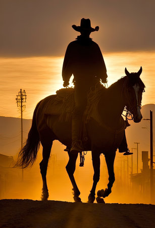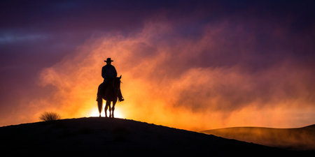 Silhouette of a cowboy riding a horse at sunset. Dramatic lighting and hazy atmosphere.