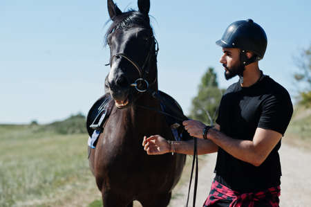 Arab tall beard man wear in black helmet, ride arabian horse.