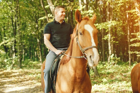 Keeping balance. Pleasant skilled man keeping balance while sitting on the horse back
