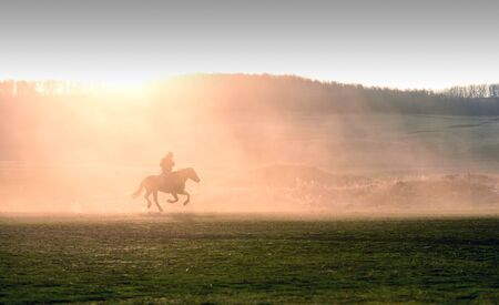 Single lone man rides a horse in sunset with dust and sunset behind creating a silhouette effect in sunlight
