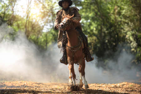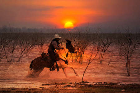 Cowboy silhouette riding a horse When the sunset looks beautiful
