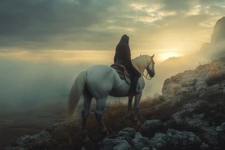 A cloaked rider sits atop a white horse, surveying a misty landscape as the sun sets behind the hills.