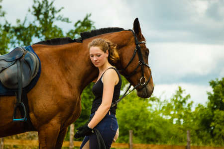 Taking care of animals, horsemanship, equine concept. Jockey young woman getting horse ready for ride on countryside.