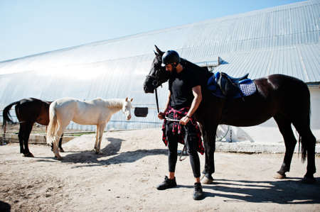 Arab tall beard man wear in black helmet with arabian horse.
