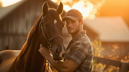 A man in a cap stands close to his horse, sharing a bond in the warm sunset light on a farm.