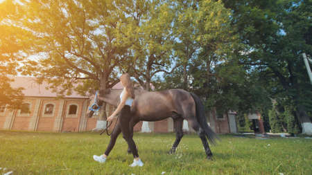 The girl walks with her beloved horse on a summer day.